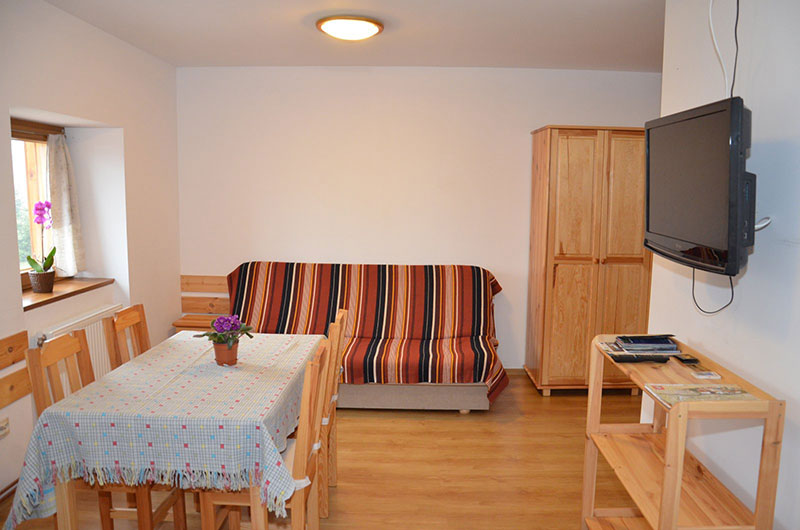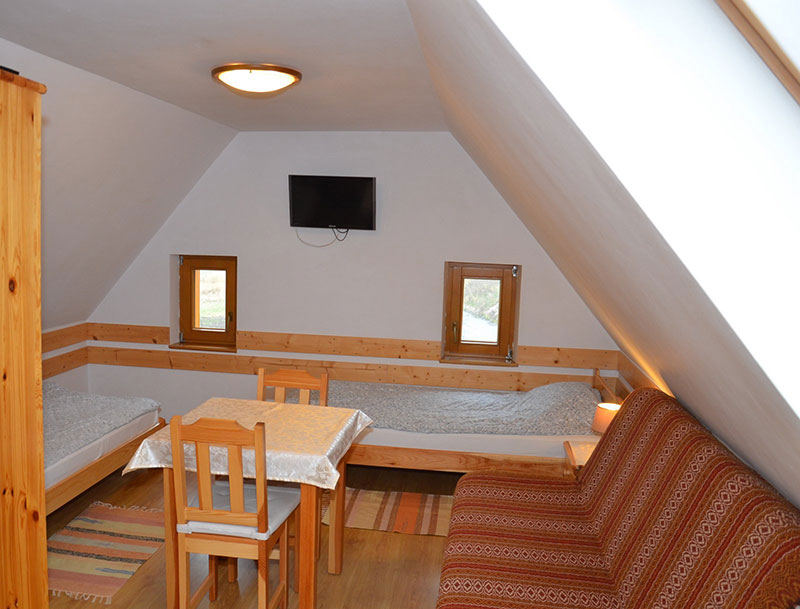 Dla gości przygotowano pokoje 2, 3, 4 i 5 osobowe z TV, łazienkami i WC. Wyposażone są w łóżka sosnowe z wygodnymi materacami i wersalkami, które sprzyjają dobremu odpoczynkowi. Do dyspozycji gości na piętrze jest aneks kuchenny wyposażony w przypisane do pokoju szafki, lodówkę, mikrofalówkę, czajnik bezprzewodowy, kawiarkę. Na parterze znajduje się ogólnodostępna kuchnia, a w holu kominek. W budynku jest dostęp do bezprzewodowego internetu Wi-Fi. W sadzie znajduje się altanka z grillem, miejsce na ognisko oraz bezpośrednie zejście do potoku. Do dyspozycji gości jest biblioteka. Można także wypożyczyć rowery górskie.