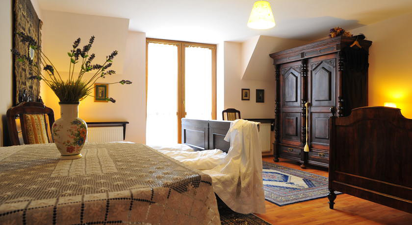 Jadalnia w naszym pensjonacie przypomina wnętrze zamożnej gospody wiejskiej z wielkimi belkami przy suficie, kredensami i kominkiem secesyjnym.