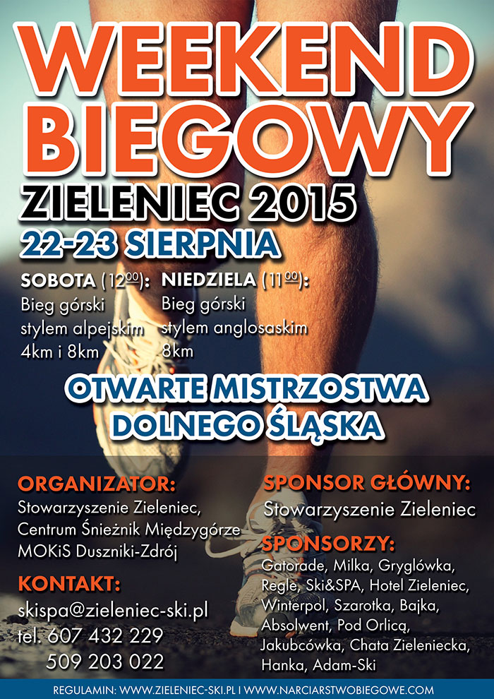 W dniach 22-23.08.2015 w Zieleńcu odbędzie się Weekend Biegowy, który równocześnie będzie też Mistrzostwami Dolnego Śląska. Na sobotę zaplanowano biegi stylem alpejskim, niedziela styl anglosaski. Organizatorzy i sponsorzy serdecznie zapraszają do Zieleńca, zarówno do startu jak również gorącego kibicowania. To już kolejna edycja imprezy, pogoda zapowiada się przyjemna, a Zieleniec zawsze warto odwiedzić!